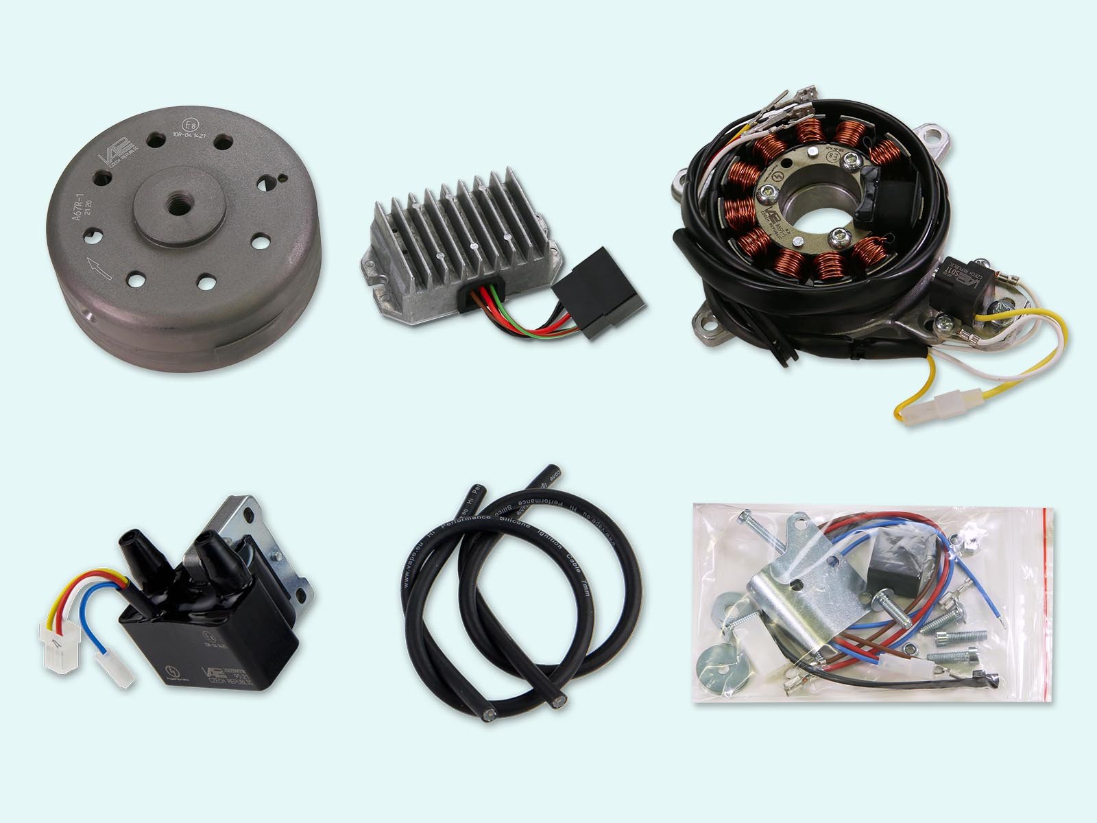 Magnet based generator with integrated fully electronic ignition. Output 12V/210W DC. Solid state ignition with own power supply from within the system. Replaces 3-phase magneton generator, points (or older electronic ignition), condenser, ignition coils. You may drive without a battery, if you want. There is no need for changes on engine casing.