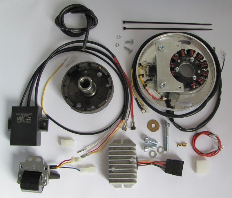 Replaces the original 6 Volt DC Noris magneto of type MLZ, incl. centrifugal governer, breaker and ignition coil. No changes on engine casing needed. Ignition coil, regulator and converter must be installed outside of the motor.